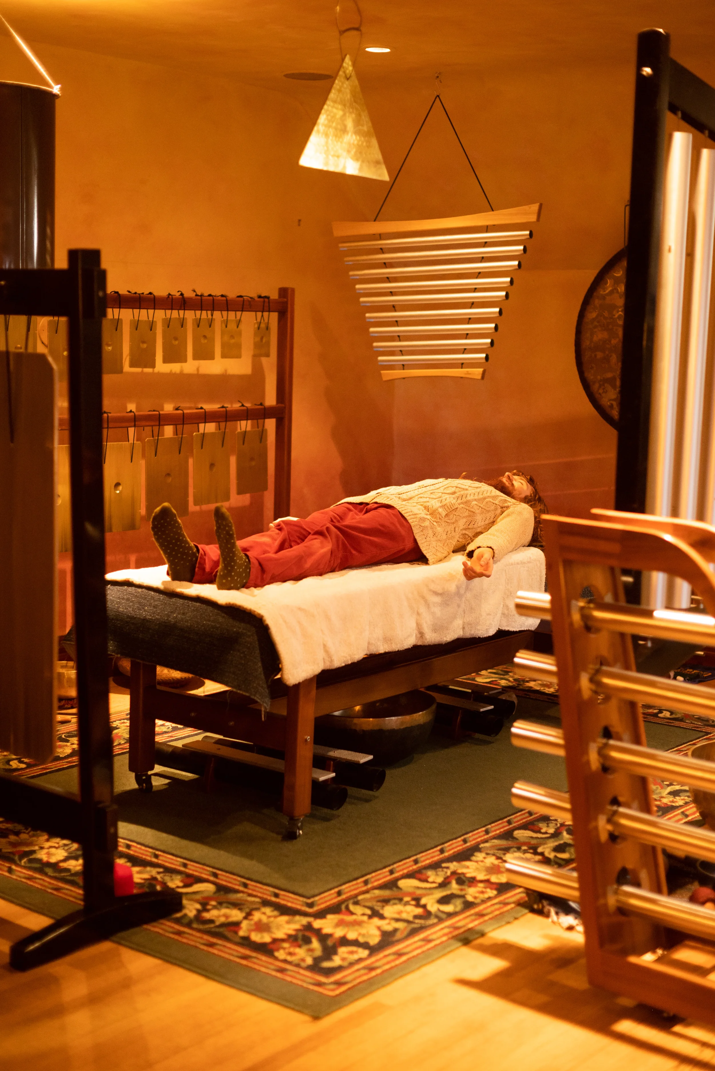 In a session, the client will lie fully clothed on a sound bed and be surrounded by instruments that will aid in the process of bringing them into their own metabolic healing forces.